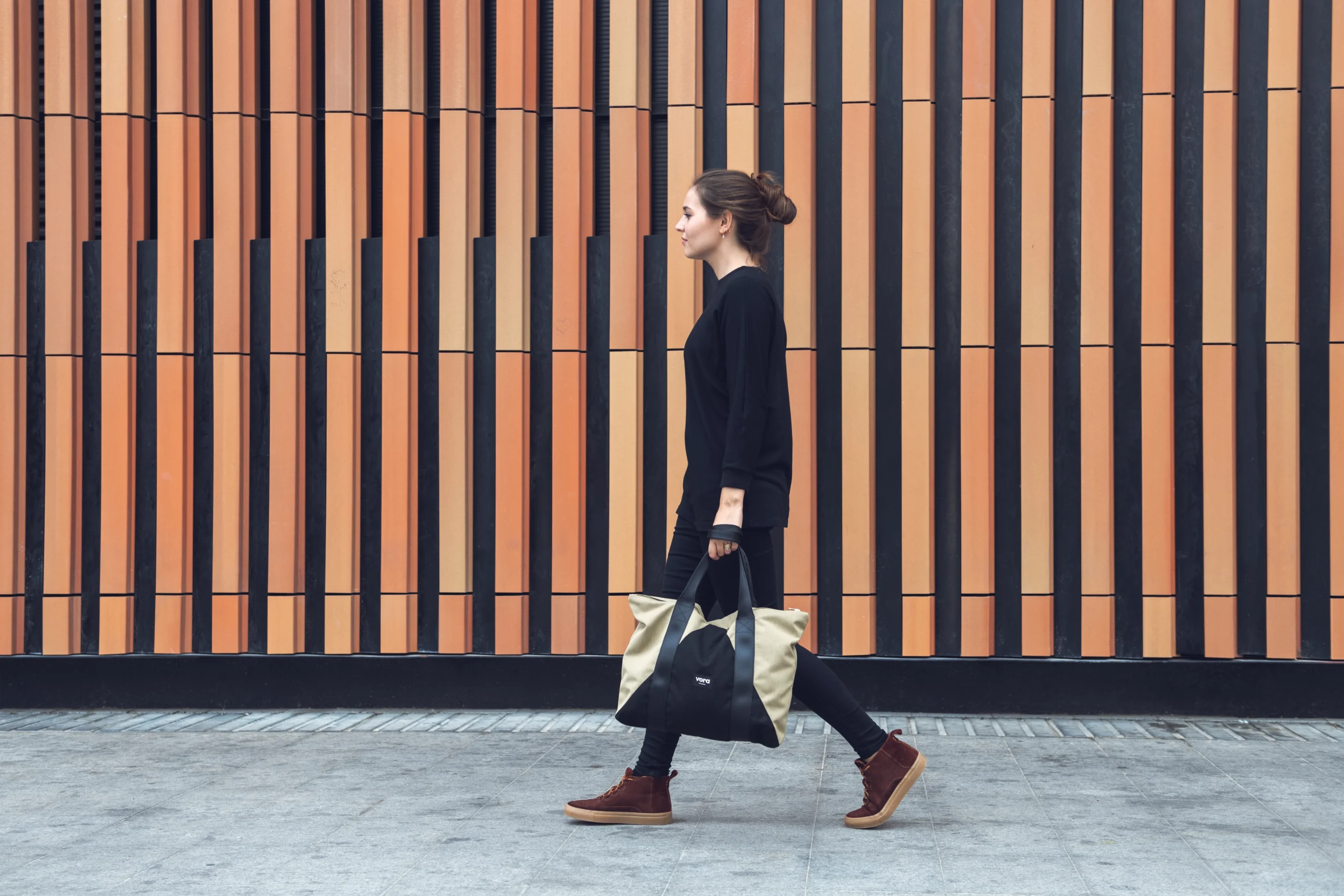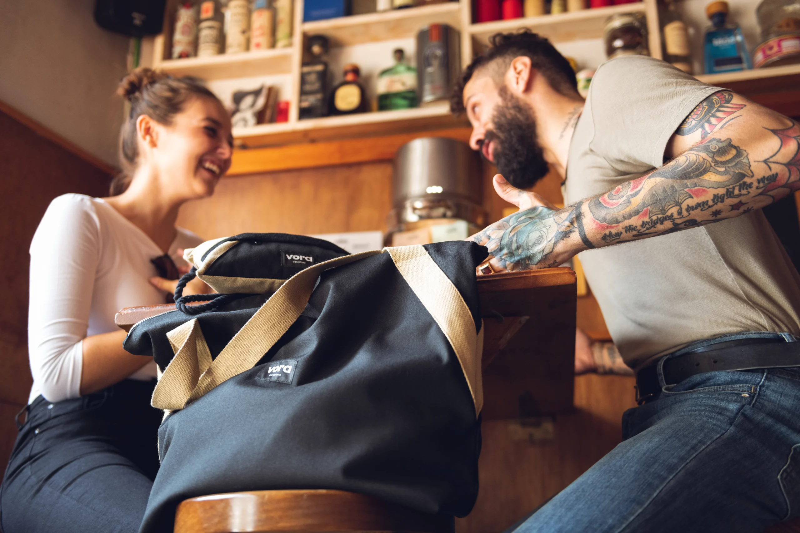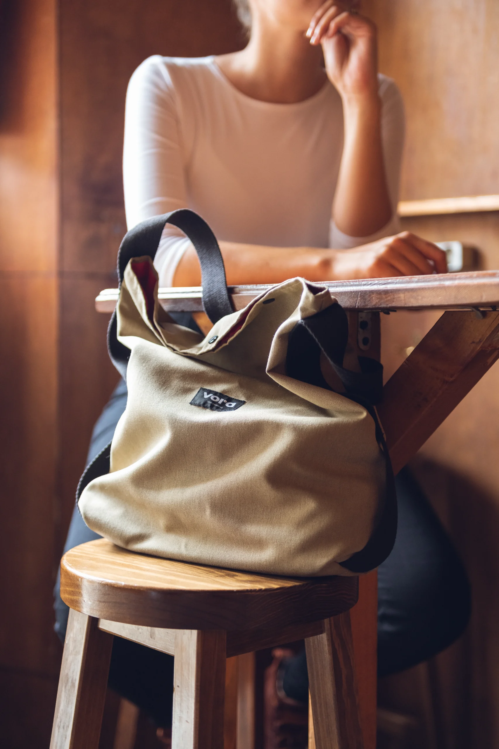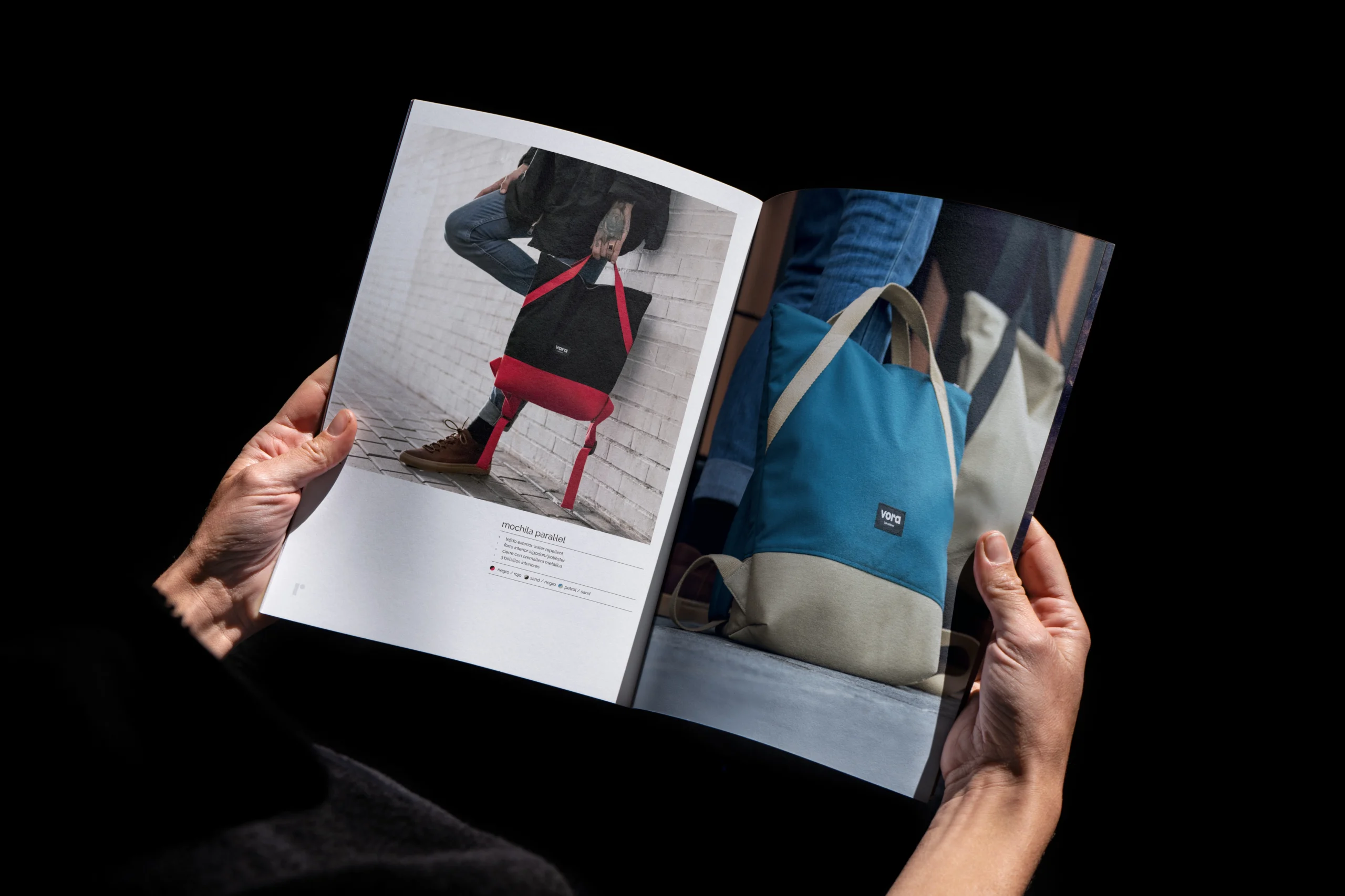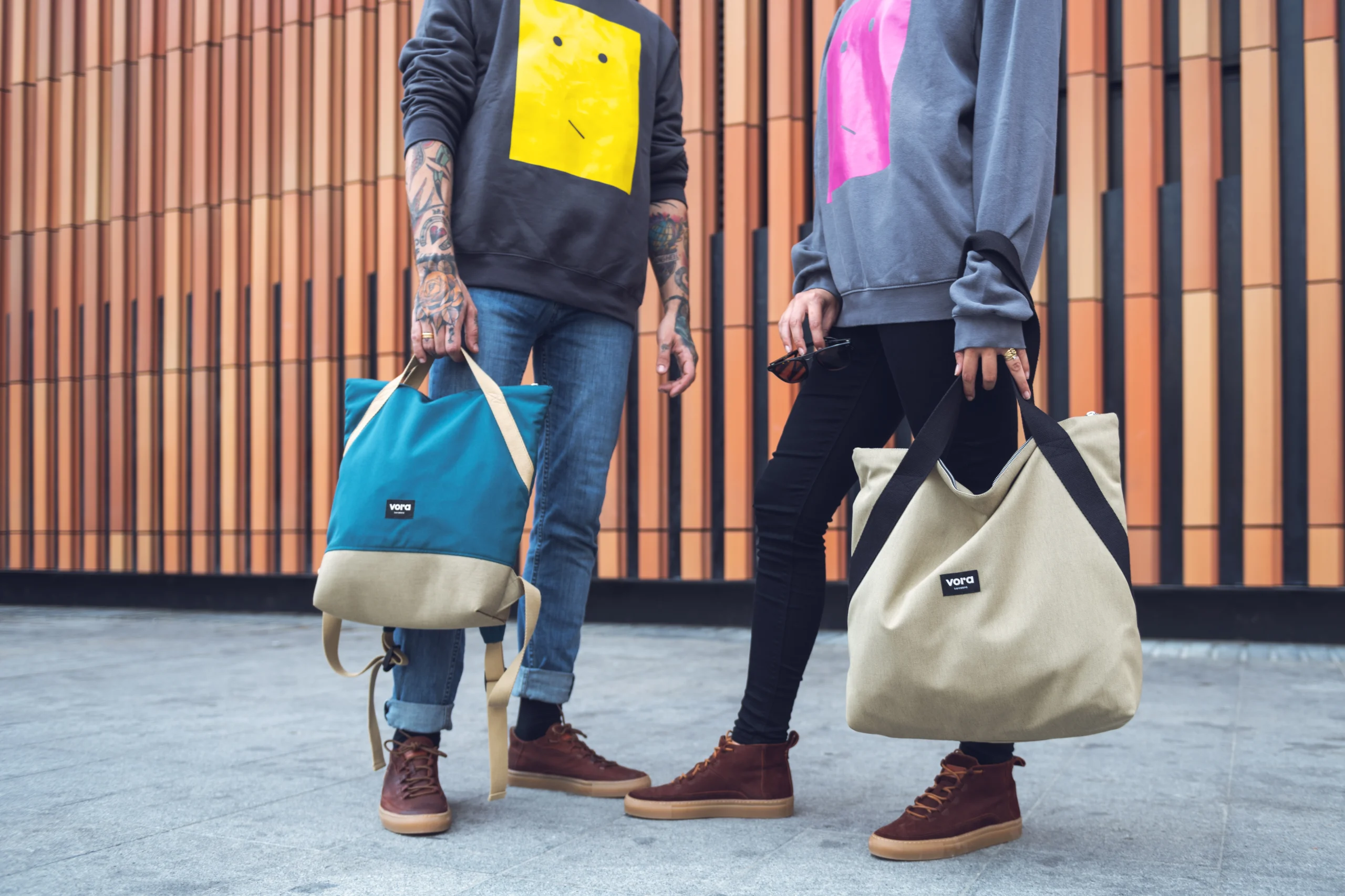 Diseño de la marca Vora Barcelona. Una empresa de creación de bolsos, mochilas de aire social ya que nace de la Funadació Ared.